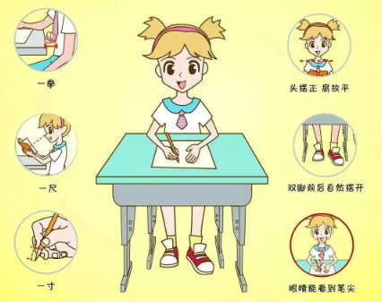 ☀ 减近距离:严格执行“一尺一拳一寸”(眼离书本一尺,胸离桌沿一拳,指离笔尖一寸) 。